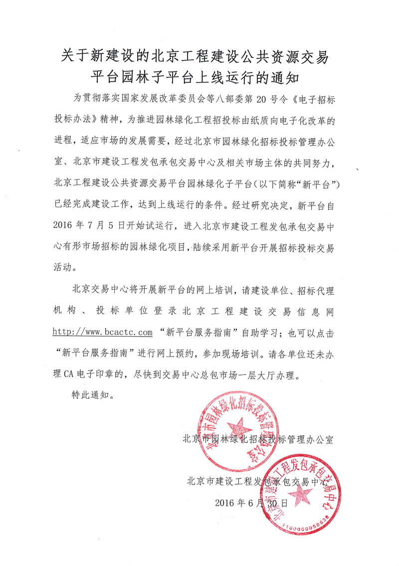 关于新建设的北京工程建设公共资源交易平台园林子平台上线运行的通知