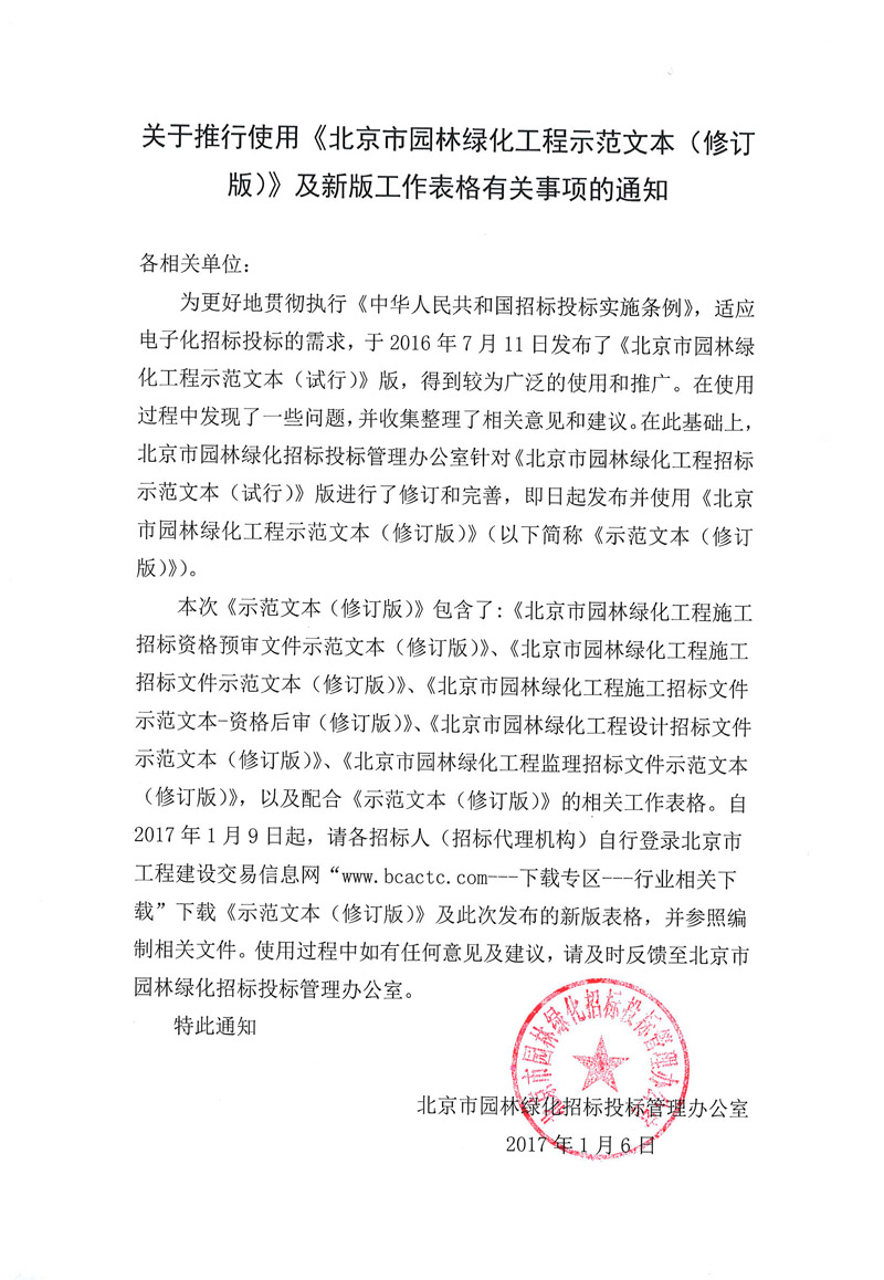关于推行使用《北京市园林绿化工程示范文本(修订版)》及新版工作表格有关事项的通知