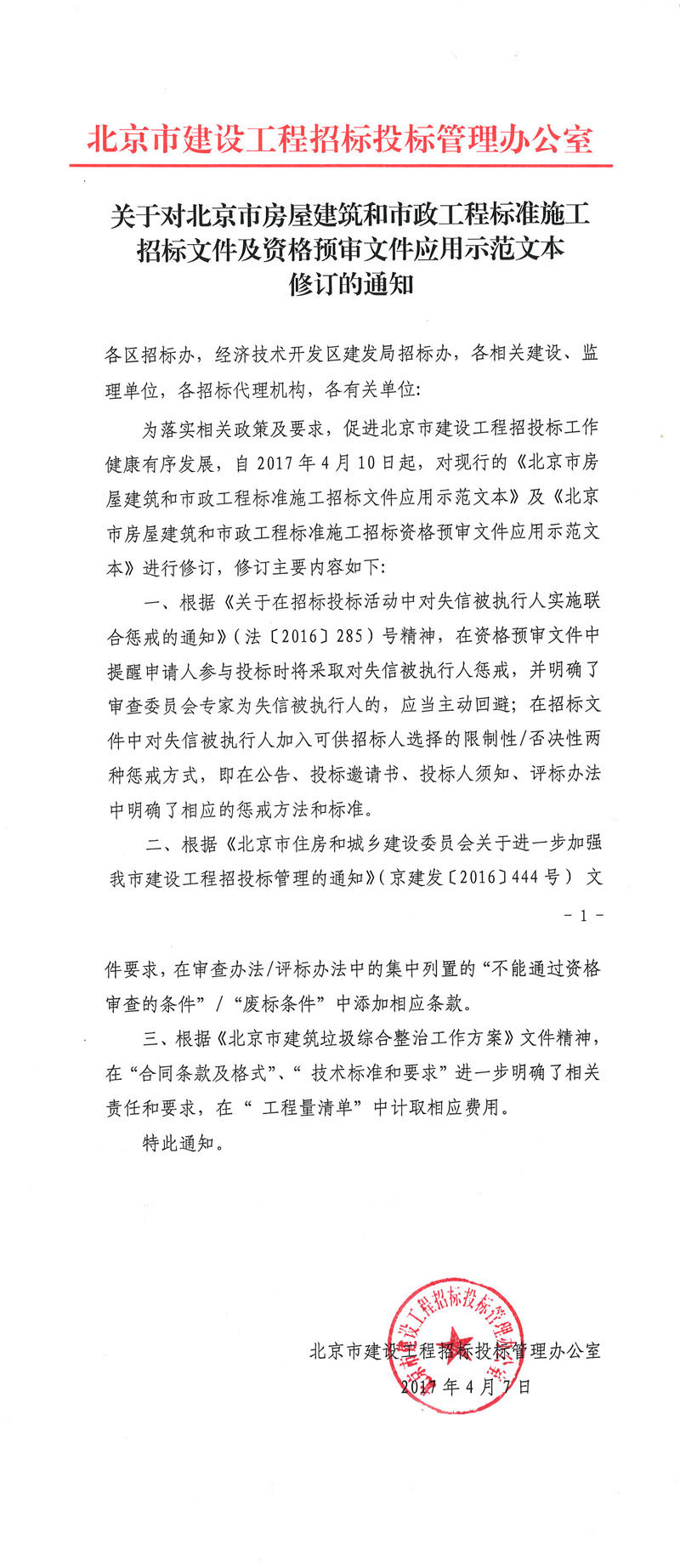 关于对北京市房屋建筑和市政工程标准施工招标文件及资格预审文件应用示范文本修订的通知