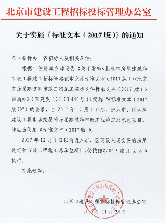 | 北京市建设工程招标投标管理办公室关于实施《标准文本(2017版)》的通知 | |||