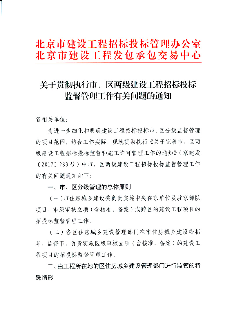 关于贯彻执行市、区两级建设工程招标投标监督管理工作有关问题的通知