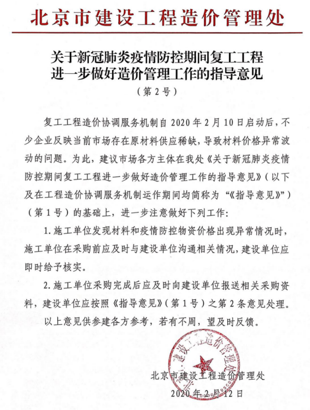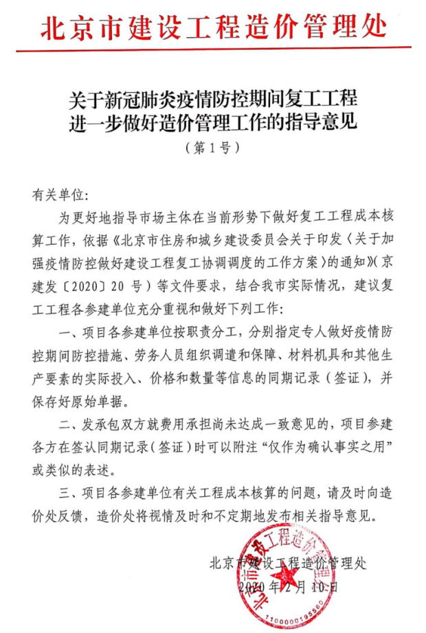 北京市建设工程造价管理处关于新冠肺炎疫情防控期间复工工程进一步做好造价管理工作的指导意见