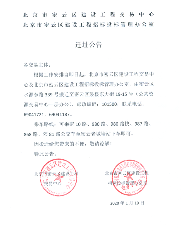 北京市密云区建设工程交易中心 北京市密云区建设工程招标投标管理办公室迁址公告