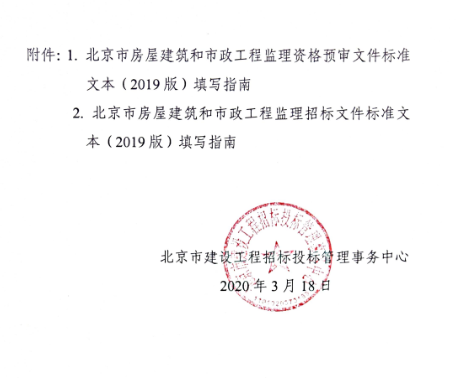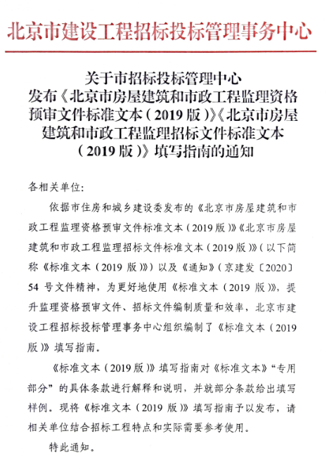 关于市招标投标管理中心发布《北京市房屋建筑和市政工程监理资格预审文件标准文本(2019版)》《北京市房屋建筑和市政工程监理招标文件标准文本(2019版)》填写指南的通知