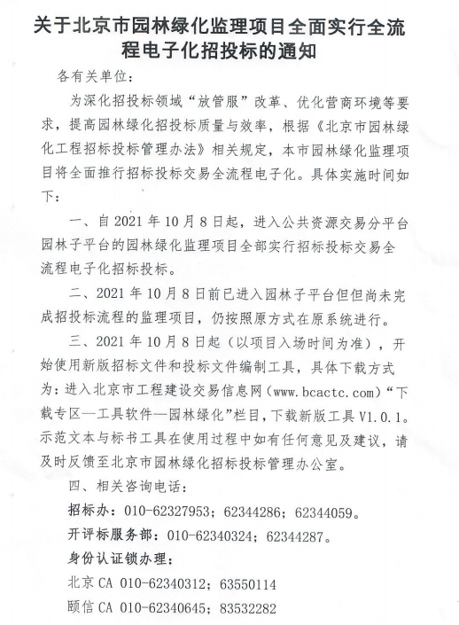 关于北京市园林绿化监理项目全面实行全流程电子化招投标的通知