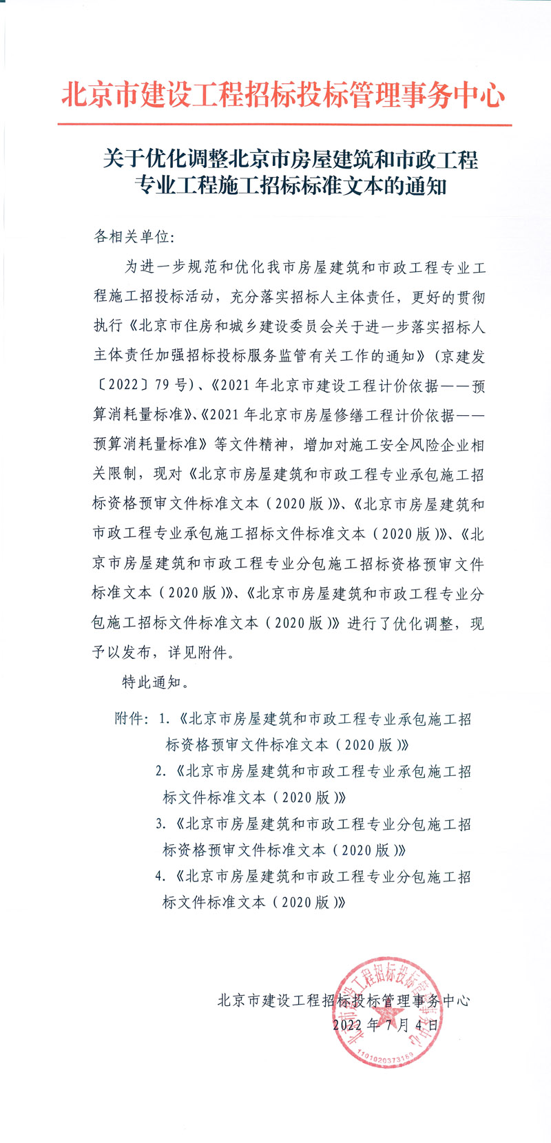 关于优化调整北京市房屋建筑和市政工程专业工程施工招标标准文本的通知