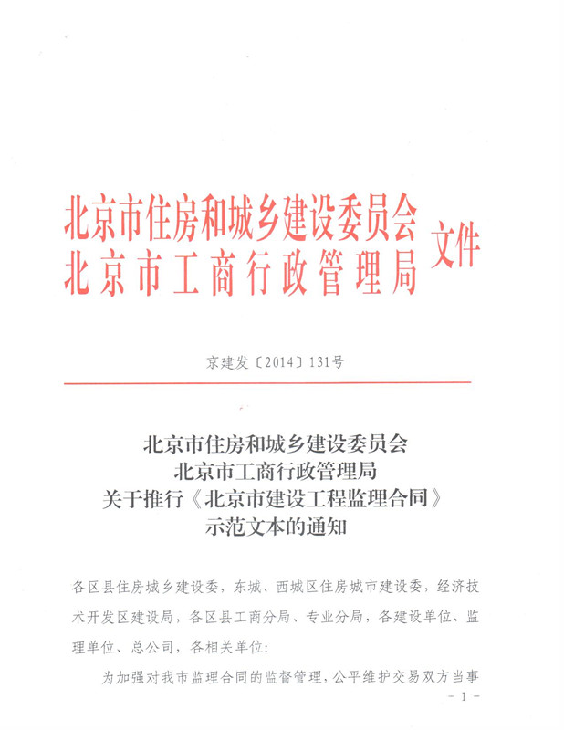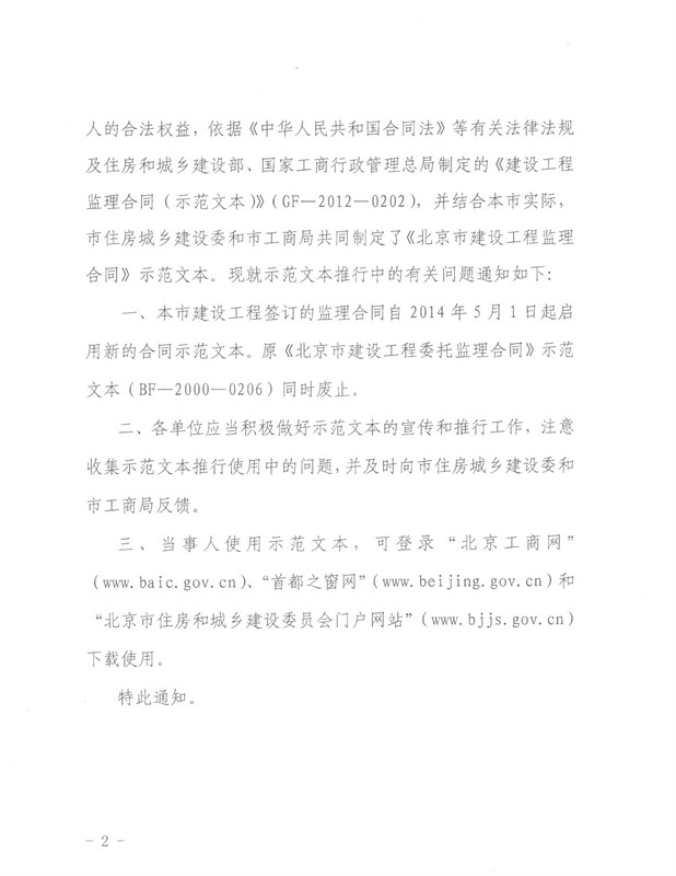 北京市住房和城乡建设委员会北京市工商行政管理局关于推行《北京市建设工程监理合同》示范文本的通知
