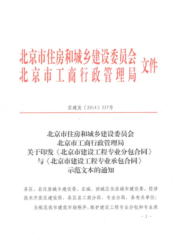 关于印发《北京市建设工程专业分包合同》与《北京市建设工程专业承包合同》示范文本的通知