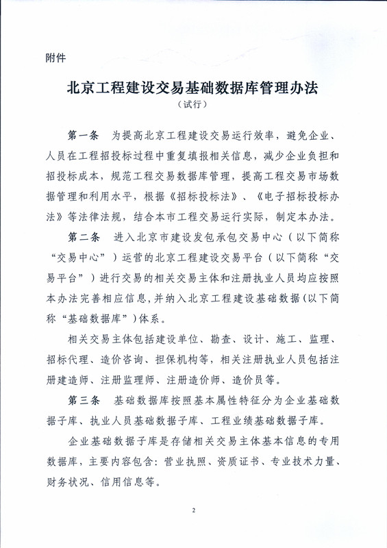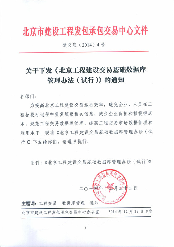 关于下发《北京工程建设交易基础数据库管理办法(试行)》的通知