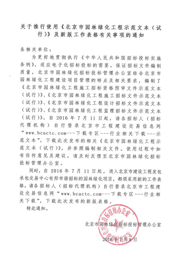 关于推行使用《北京市园林绿化工程示范文本(试行)》及新版工作表格有关事项的通知